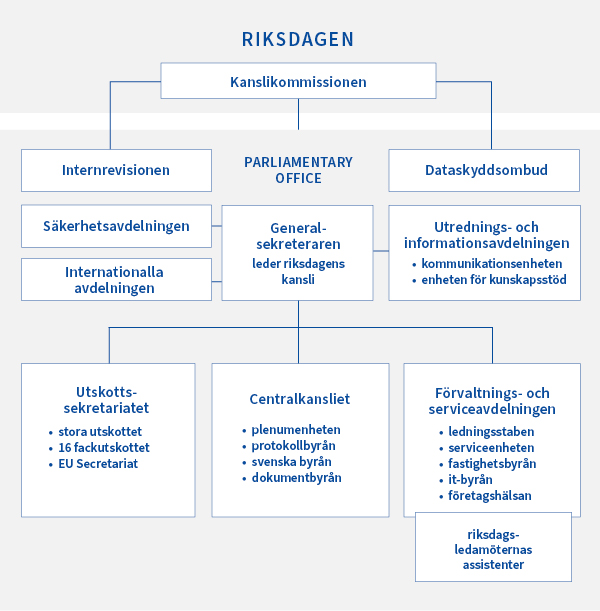 Riksdagens kansli leds av riksdagens generalsekreterare Maija-Leena Paavola. Kansliet har sex verksamhetsenheter som har hand om lagstiftningsarbete, utskottsarbete, internationella ärenden, informations- och utredningtjänster, förvaltning  och säkerhet.