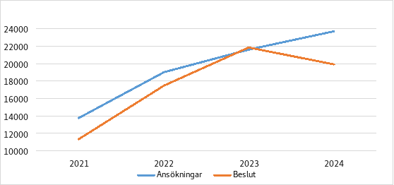 Under 2021–2024 lämnades sammanlagt 78 083 första ansökningar om uppehållstillstånd på grund av familjeband in. År 2021 lämnades det in sammanlagt 13 764 ansökningar, år 2022 sammanlagt 18 981 ansökningar och år 2023 sammanlagt 21 583 ansökningar. Antalet an-sökningar höll sig på en hög nivå också 2024, då det lämnades in sammanlagt 23 701 första ansökningar om uppehållstillstånd för familjemedlemmar. Antalet ansökningar är det största i mäthistorien. Mäthistoria fr.o.m. 2011.