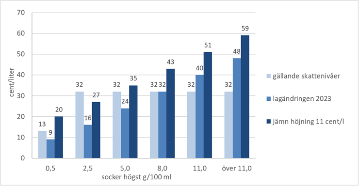 Enligt den lägsta skattesatsen beskattas sockerfria produkter i skattetabellen. Skattesatsen för sockerfria produkter höjs med sju cent jämfört med den gällande skattesatsen. Också drycker som inte är färdigförpackade och som uppfyller definitionen inte färdigförpackad i 2 § 1 mom. 5 punkten ska beskattas enligt den lägsta skattesatsen. Drycker som inte är färdigförpackade ska enligt förslaget anges i sina egna tulltariffnummerspecifika produktgrupper. Skatten på drycker med socker som hör till skattebasen föreslås i fortsättningen vara graderad i skattesatser enligt produktens sockerhalt. Den övre gränsen för sockerhalten enligt den lägsta skattegraden för sockerhaltiga drycker föreslås vara 2,5 gram socker per 100 milliliter dryck och motsvara den övre gränsen för sockerhalten för livsmedel i flytande form med låg sockerhalt enligt förordningen om hälsopåståenden.