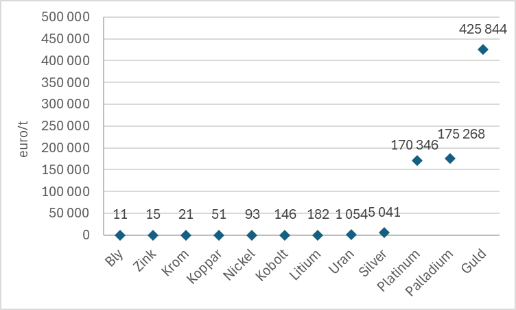Värdet av den finländska gruvproduktionen varierar enligt mineralernas värde, i synnerhet enligt metallernas världsmarknadspriser, samt produktionsvolymerna. I fråga om metaller kan gruvproduktionens kalkylmässiga värde uppskattas utifrån världsmarknadspriserna efter anrikningen, smältningen och den övriga vidareförädlingen. Gruvproduktionens värde beskriver i så fall värdet av produktionen av vidareförädlade gruvmineral och inte egentligen slutprodukten av gruvdriften, det vill säga främst koncentratets värde, som är lägre än värdet av vidareförädlade gruvmineral. Räknat på detta sätt var värdet av de metaller som producerats av metallmalm som brutits i den inhemska gruvproduktionen, det vill säga i Finland, omkring 2,5 miljarder euro år 2024. Så som framgår av figur 2 nedan, utgjordes de klart största metallerna vad gäller produktionsvärde av krom, nickel och guld.