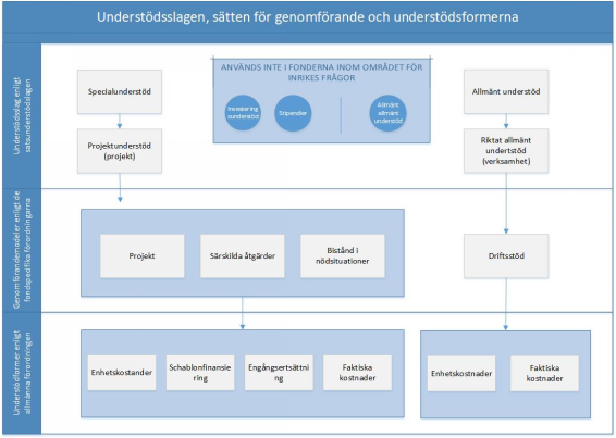 Den centrala metoden för målet att lätta upp förvaltningen av fonderna på EU-nivå under programperioden 2014–2020 var förenklade kostnadsmodeller. Av dem infördes nationellt en engångsersättning, modeller för schablonfinansiering (kostnader som ersätts enligt ett procenttal) samt standardiserade skalor av enhetskostnader. Användningen av modellen med engångsersättning har under programperioden varit mycket liten delvis på grund av att vid användning av modellen kunde projektbudgeten fram till 2017 vara högst 10 000 euro. Därefter har budgeten kunnat uppgå till högst 100 000 euro. Den ringa användningen av modellen torde också förklaras av att modellen innebär en större risk ur understödstagarens synvinkel, eftersom de mål som uppställts för projektet ska nås helt och hållet för att understödet ska betalas till projektet. Dessutom sker utbetalningen av understödet i en post efter att projektet avslutats. Modeller för schablonfinansiering har använts mycket i projekten. Modellerna för schablonfinansiering fastställs genom tillämpning av en viss procentandel på ett eller flera specificerade kostnadsslag. Modellerna för schablonfinansiering för fonderna inom området för inrikes frågor baserade sig på den modell som användes i Finland inom strukturfonderna, där projektets indirekta kostnader (15 %-modellen) eller indirekta kostnader och resekostnader (17 %-modellen) ersattes som en procentandel av projektets lönekostnader. Modellen gjorde det enklare att budgetera, följa upp och rapportera om projektkostnaderna. Standardiserade skalor av enhetskostnader har använts för vissa kostnader för placering i kommunen av personer som tagits emot i Finland inom ramen för flyktingkvoten eller som fått uppehållstillstånd med stöd av utlänningslagen och sedan 2017 också för kostnader för understöd för frivillig återresa. År 2020 infördes dessutom en modell med standardiserade enhetskostnader för lönekostnaderna. Syftet med modellen för lönekostnader var att förenkla rapporteringen och granskningen av lönekostnaderna för projekten. Erfarenheterna av användningen av modellen är på grund av det sena införandet av modellen fortfarande begränsade. Trots de förenklade kostnadsmodellerna har en betydande del av kostnaderna för projekten och verksamheten under programperioden 2014–2020 fortfarande ersatts på basis av de faktiska kostnaderna.