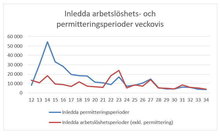 Till skillnad från antalet inkomna ansökningar återspeglar olika överklagbara beslut som meddelats med anledning av ansökningar om arbetslöshetsdagpenning hur handläggningsarbetet framskrider. Som alternativ bedömdes följande helheter av beslutstyper och förändringar i dem: påbörjade beslut Med ett påbörjat beslut avses ett beslut där uppfyllandet av arbetsvillkoret har utretts och där maximitiden för inkomstrelaterad dagpenning börjar räknas från början., alla beslut med undantag av beslut som grundar sig på ett negativt arbetskraftspolitiskt utlåtande och alla beslut.