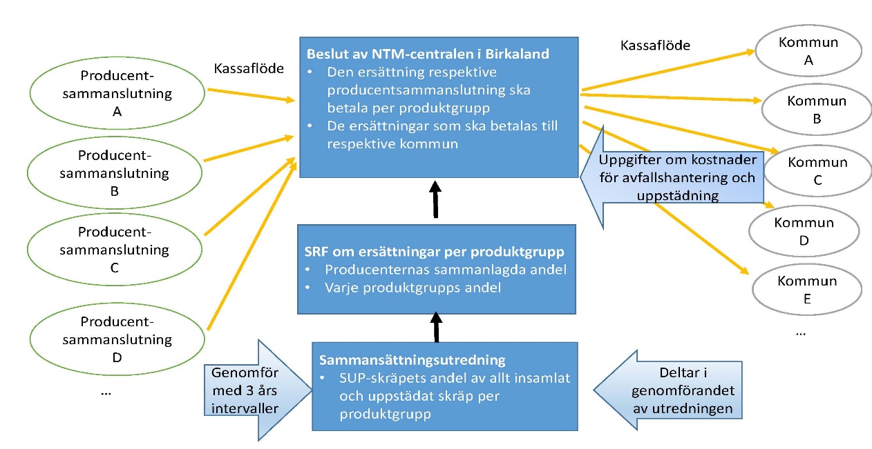 Enligt 2 mom. ska Närings-, trafik- och miljöcentralen i Birkaland fatta beslut om ersättningarna. I beslutet ska anges den totala ersättning en producentsammanslutning eller enskild producent som godkänts för införande i producentregistret ska betala, specificerad enligt produktgrupp, och den totala ersättning som ska betala till respektive kommun. Beslutet ska ges för kännedom till producentsammanslutningarna och producenterna samt till de kommuner som meddelat sina kostnader. Producentsammanslutningen eller producenten ska betala ersättningarna till Närings-, trafik- och miljöcentralen i Birkaland, som redovisar dem vidare till kommunerna enligt de andelar som anges i beslutet. Det förfarandet innebär att de administrativa kostnaderna för betalning av ersättningarna blir så små som möjligt med beaktande av helheten. Producenten också för myndighetskostnaderna för indrivning av ersättningarna och redovisning av dem till kommunerna.
