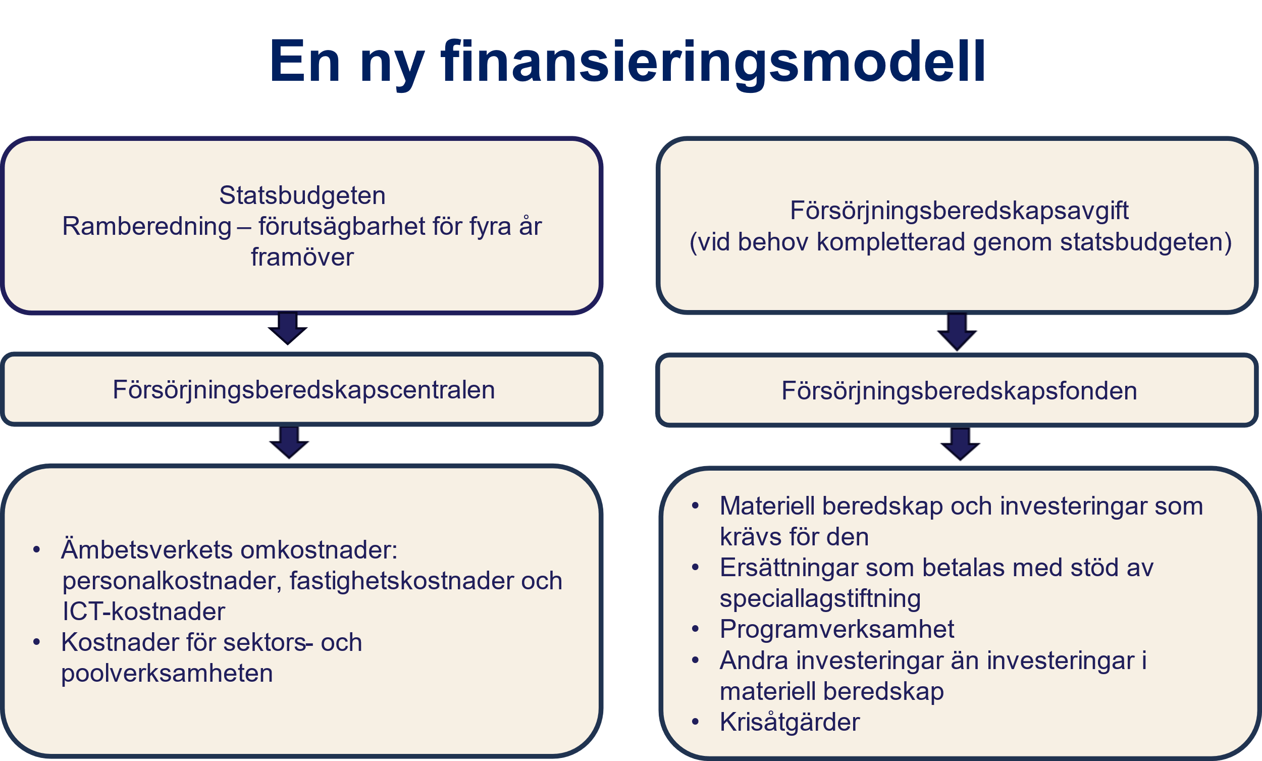 Försvaret kommer fortfarande att nämnas i definitionen av försörjningsberedskap, men därutöver föreslås det att även säkerhet fogas till definitionen. Utöver de funktioner som är kritiska med tanke på landets försvar ska man vid behov också kunna trygga de kritiska funktionerna för aktörerna inom den inre säkerheten, dvs. polisens, gränsbevakningsväsendets, räddningsväsendets, transport- och kommunikationsverkets och migrationsmyndigheternas kritiska funktioner.