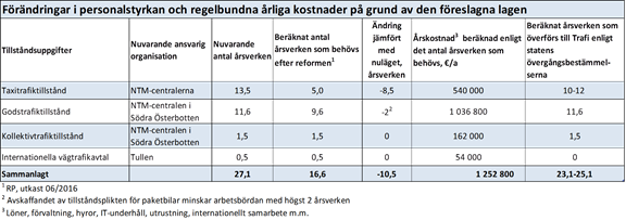 När ändringen införs är avsikten att ordna skötseln av uppgifterna så att den personal som förflyttas kan fortsätta att arbeta på samma orter som i dag. För närvarande ansvarar NTM-centralen i Södra Österbotten för kollektiv- och godstrafiktillstånden medan fyra NTM-centraler (NTM-centralerna i Södra Österbotten, Lappland, Norra Savolax och Nyland) ansvarar för taxitrafiktillstånden. De personer som sköter uppgifterna är emellertid placerade vid olika NTM-centraler runt om i landet. Tillståndsuppgifterna sköts i Helsingfors (6 personer), Joensuu (2 personer), Jyväskylä (1 person), Kouvola (2 personer), Kuopio (3 personer), S:t Michel (1 person), Uleåborg (1 person), Rovaniemi (1 person), Seinäjoki (5 personer), Tammerfors (1 person), Åbo (1 person) och Vasa (5 personer). Bland dessa orter har Trafiksäkerhetsverket verksamhet i Helsingfors, Åbo, Uleåborg, Rovaniemi och Vasa.