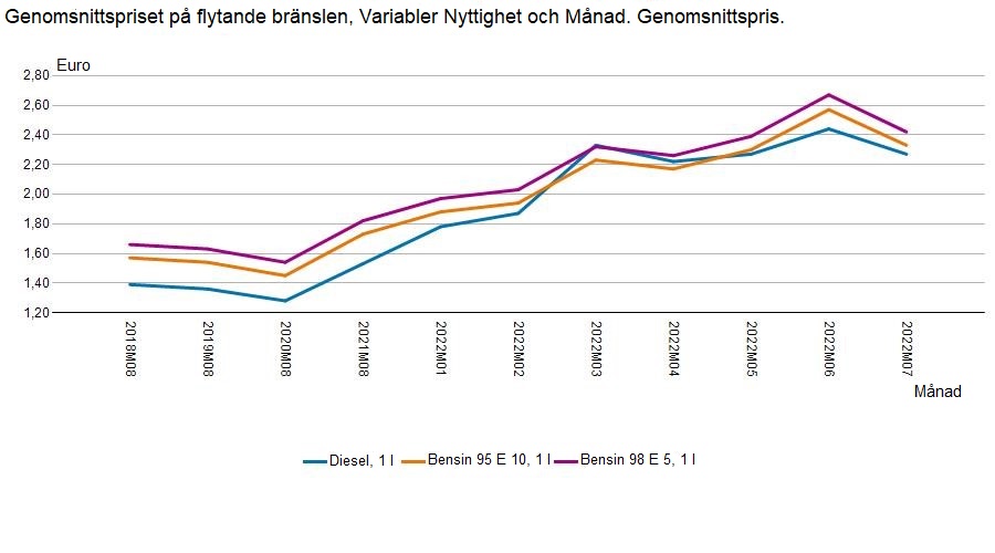 Figur 1. Genomsnittspriset på flytande bränslen från 2018 till juli 2022 (källa: Statistikcentralen)