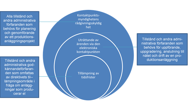 I artikel 16 i RED II föreskrivs att medlemsstaterna ska inrätta eller utse en eller flera kontaktpunkter. De utsedda kontaktpunkterna ska, på begäran av den sökande, tillhandahålla vägledning och underlätta hela det administrativa ansöknings- och tillståndsförfarandet, från bekräftelsen på att ansökan har mottagits till översändande av resultatet av förfarandet. Den sökande ska inte behöva kontakta mer än en kontaktpunkt under hela förfarandet. Sökande ska även ha rätt att lämna in relevanta handlingar i digital form. Kontaktpunkten ska vägleda sökanden genom det administrativa ansökningsförfarandet på ett transparent sätt fram till dess att ansvarig myndighet i processens slutskede fattar ett eller flera beslut, förse sökanden med all nödvändig information och vid behov involvera andra administrativa myndigheter. Tillämpningsområdet för bestämmelserna om tillståndsförfarandet enligt ovan ska omfatta samtliga relevanta administrativa tillstånd för uppförande, uppgradering och drift av anläggningar för produktion av energi från förnybara energikällor samt för anslutning av dessa till elnätet.
