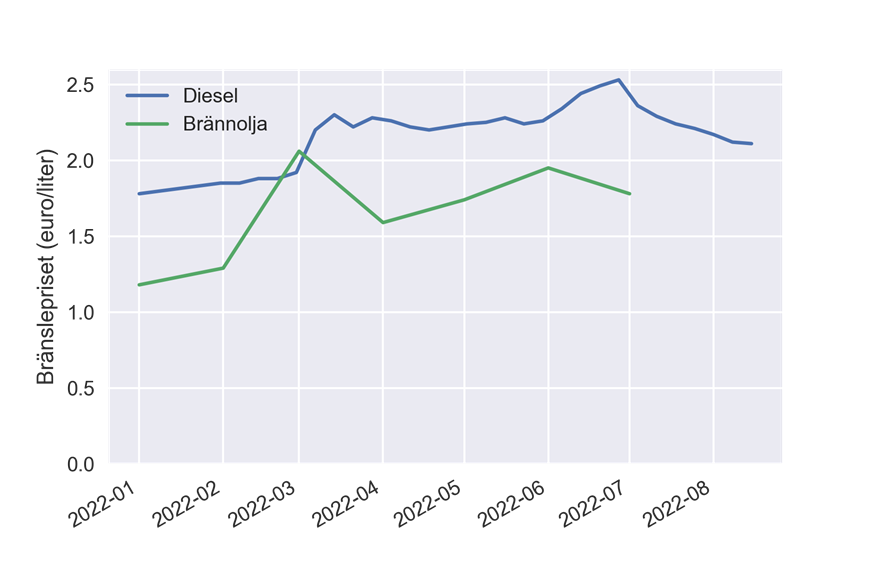 Särskilt efter krigshandlingarna i Ukraina ökade brännoljekostnaderna snabbt, varefter det skedde en stabilisering. Kostnaderna har stannat på en nivå som för diesel är cirka 20 procent och för brännolja cirka 50 procent högre än under tiden före kriget.