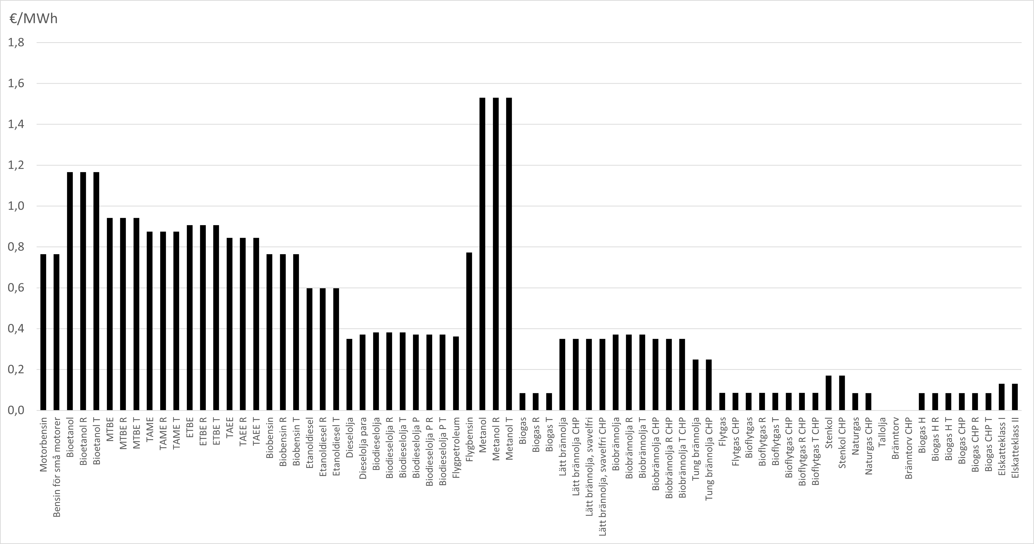 Avgiftens storlek är inte heller logisk till exempel med tanke på energiinnehållet i olika energiprodukter. Såsom framgår av figur 1 är försörjningsberedskapsavgiften för drivmedel högst för sådana bränslen som ersätter fossil motorbensin och fossilt diesel och som ofta är biobaserade. Försörjningsberedskapsavgifterna för naturgas och elström som används i trafiken är låga. När det är fråga om bränslen för uppvärmning är försörjningsberedskapsavgiften högst för oljeprodukter och lägst för flytgas, naturgas och biogas samt torv, på vilken det inte tas ut någon försörjningsberedskapsavgift. Försörjningsberedskapsavgiften för elström är låg per energienhet också jämfört med många uppvärmningsbränslen, såsom brännolja.