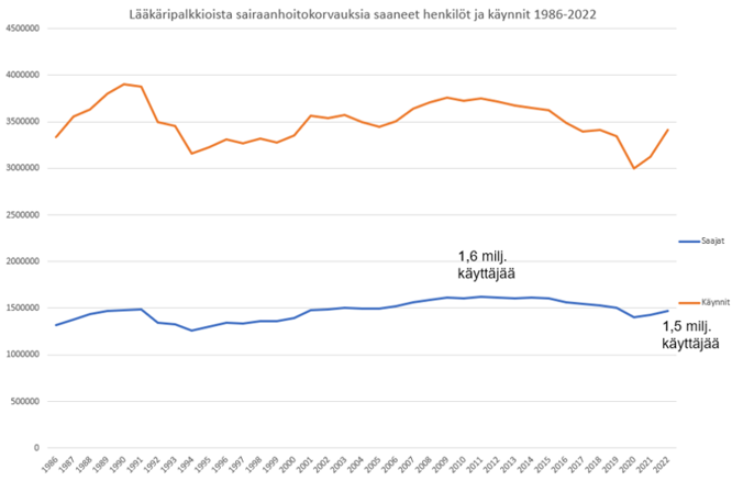 Personer som fått ersättningar för läkararvoden samt besök 1986–2022. Källa: FPA:s forskning. Texten i bilden lyder på svenska: Lääkärinpalkkioista sairaanhoitokorvauksia saaneet henkilöt ja käynnit 1986–2022 = Personer som fått sjukvårdsersättningar för läkararvoden samt besök 1986–2022, Saajat = Mottagare, Käynnit = Besök, 1,6 milj. käyttäjää = 1,6 mn användare, 1,5 milj. käyttäjää = 1,5 mn användare.