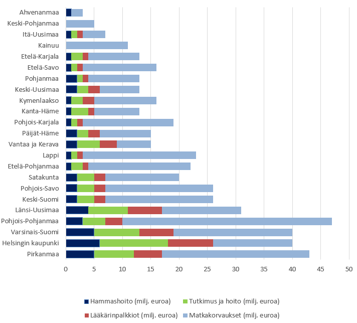 Ersättningar för privat sjukvård samt reseersättningar för offentlig och privat hälso- och sjukvård i de nuvarande välfärdsområdena samt i Helsingfors stad och Åland 2022.Texten i bilden lyder på svenska: Ahvenanmaa = Åland, Keski-Pohjanmaa = Mellersta Österbotten, Itä-Uusimaa = Östra Nyland, Kainuu = Kajanaland, Etelä-Karjala = Södra Karelen, Etelä-Savo = Södra Savolax, Pohjanmaa = Österbotten, Keski-Uusimaa = Mellersta Nyland, Kymenlaakso = Kymmenedalen, Kanta-Häme = Egentliga Tavastland, Pohjois-Karjala = Norra Karelen, Päijät-Häme = Päijänne-Tavastland, Vantaa ja Kerava = Vanda och Kervo, Lappi = Lappland, Etelä-Pohjanmaa = Södra Österbotten, Satakunta = Satakunta, Pohjois-Savo = Norra Savolax, Keski-Suomi = Mellersta Finland, Länsi-Uusimaa = Västra Nyland, Pohjois-Pohjanmaa = Norra Österbotten, Varsinais-Suomi = Egentliga Finland, Helsingin kaupunki = Helsingfors stad, Pirkanmaa = Birkaland, Hammashoito (milj. euroa) = Tandvård (mn euro), Tutkimus ja hoito (milj. euroa) = Undersökningar och vård (mn euro), Lääkärinpalkkiot (milj. euroa) = Läkararvoden (mn euro), Matkakorvaukset (milj. euroa) = Reseersättningar (mn euro).