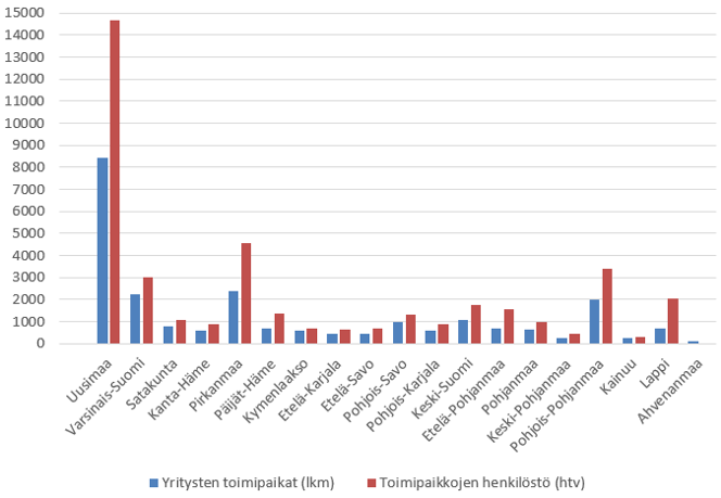 Verksamhetsställen och antal anställda för hälso- och sjukvårdssektorns företag enligt landskap 2022. Texten i bilden lyder på svenska: Uusimaa = Nyland, Varsinais-Suomi = Egentliga Finland, Satakunta = Satakunta, Kanta-Häme = Egentliga Tavastland, Pirkanmaa = Birkaland, Päijät-Häme = Päijänne-Tavastland, Kymenlaakso = Kymmenedalen, Etelä-Karjala = Södra Karelen, Etelä-Savo = Södra Savolax , Pohjois-Savo = Norra Savolax, Pohjois-Karjala = Norra Karelen, Keski-Suomi = Mellersta Finland, Etelä-Pohjanmaa = Södra Österbotten, Pohjanmaa = Österbotten, Keski-Pohjanmaa = Mellersta Österbotten, Pohjois-Pohjanmaa = Norra Österbotten, Kainuu = Kajanaland, Lappi = Lappland, Ahvenanmaa = Åland, Yritysten toimipaikat (lkm) = Företagens verksamhetsställen (antal), Toimipaikkojen henkilöstö (htv) = Verksamhetsställenas anställda (årsverken).