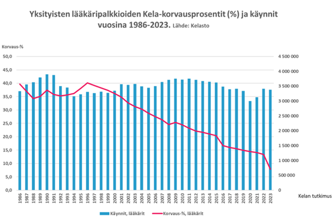 Ersättningsprocent för ersättningar för privatläkararvoden samt besök 1986–2023. Källa: FPA:s forskning. Texten i bilden lyder på svenska: Yksityisten lääkäripalkkioiden Kela-korvausprosentit (%) ja käynnit vuosina 1986–2023. Lähde: Kelasto = FPA-ersättningsprocent för privatläkararvoden (%) samt besök 1986–2023. Källa: Kelasto, Korvaus-% = Ersättnings-%, Kelan tutkimus = FPA:s forskning, Käynnit, lääkärit = Besök, läkare, Korvaus-%, lääkärit = Ersättnings-%, läkare.