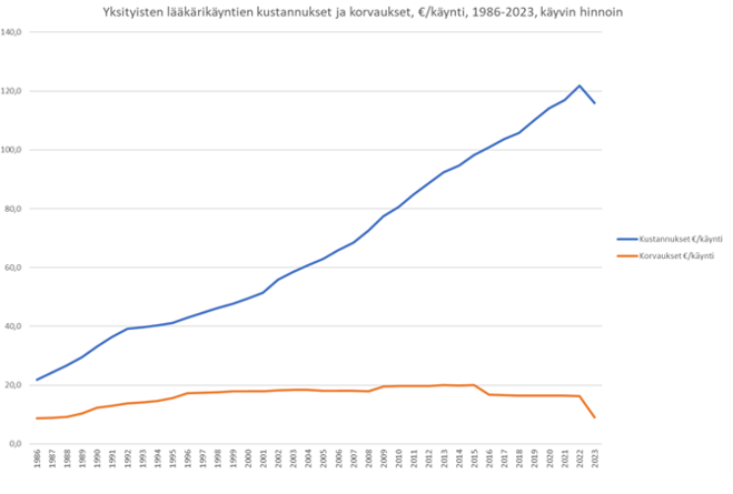 Kostnader och ersättningar för besök hos privatläkare 1986–2023. Källa: FPA:s forskning. Texten i bilden lyder på svenska: Yksityisten lääkärikäyntien kustannukset ja korvaukset, €/käynti, 1986–2023, käyvin hinnoin = Kostnader och ersättningar för besök hos privatläkare, €/besök, 1986–2023, verkliga priser, Kustannukset €/käynti = Kostnader €/besök, Korvaukset €/käynti = Ersättningar €/besök.