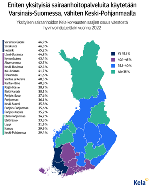 Andelen mottagare av ersättningar för privat sjukvård av befolkningen enligt välfärdsområde 2022. Texten i bilden lyder på svenska: Eniten yksityisiä sairaanhoitopalveluita käytetään Varsinais-Suomessa, vähiten Keski-Pohjanmaalla = Mest privata sjukvårdstjänster anlitas i Egentliga Finland, minst i Mellersta Österbotten, Yksityisen sairaanhoidon Kela-korvausten saajien osuus väestöstä hyvinvointialueittain vuonna 2022 = Andelen mottagare av FPA-ersättningar för privat sjukvård av befolkningen enligt välfärdsområde 2022, Varsinais-Suomi = Egentliga Finland, Satakunta = Satakunta, Helsinki = Helsingfors, Länsi-Uusimaa = Västra Nyland, Kymenlaakso = Kymmenedalen, Ahvenanmaa = Åland, Keski-Uusimaa = Mellersta Nyland, Itä-Uusimaa = Östra Nyland, Pirkanmaa = Birkaland, Vantaa ja Kerava = Vanda och Kervo, Kanta-Häme = Egentliga Tavastland, Päijät-Häme = Päijänne-Tavastland, Etelä-Karjala = Södra Karelen, Pohjois-Savo = Norra Savolax, Pohjanmaa = Österbotten, Keski-Suomi = Mellersta Finland, Pohjois-Pohjanmaa = Norra Österbotten, Pohjois-Karjala = Norra Karelen, Etelä-Pohjanmaa = Södra Österbotten, Etelä-Savo = Södra Savolax, Lappi = Lappland, Kainuu = Kajanaland, Keski-Pohjanmaa = Mellersta Österbotten, Yli 45,1 % = Över 45,1 %, Alle 35 % = Under 35 %.