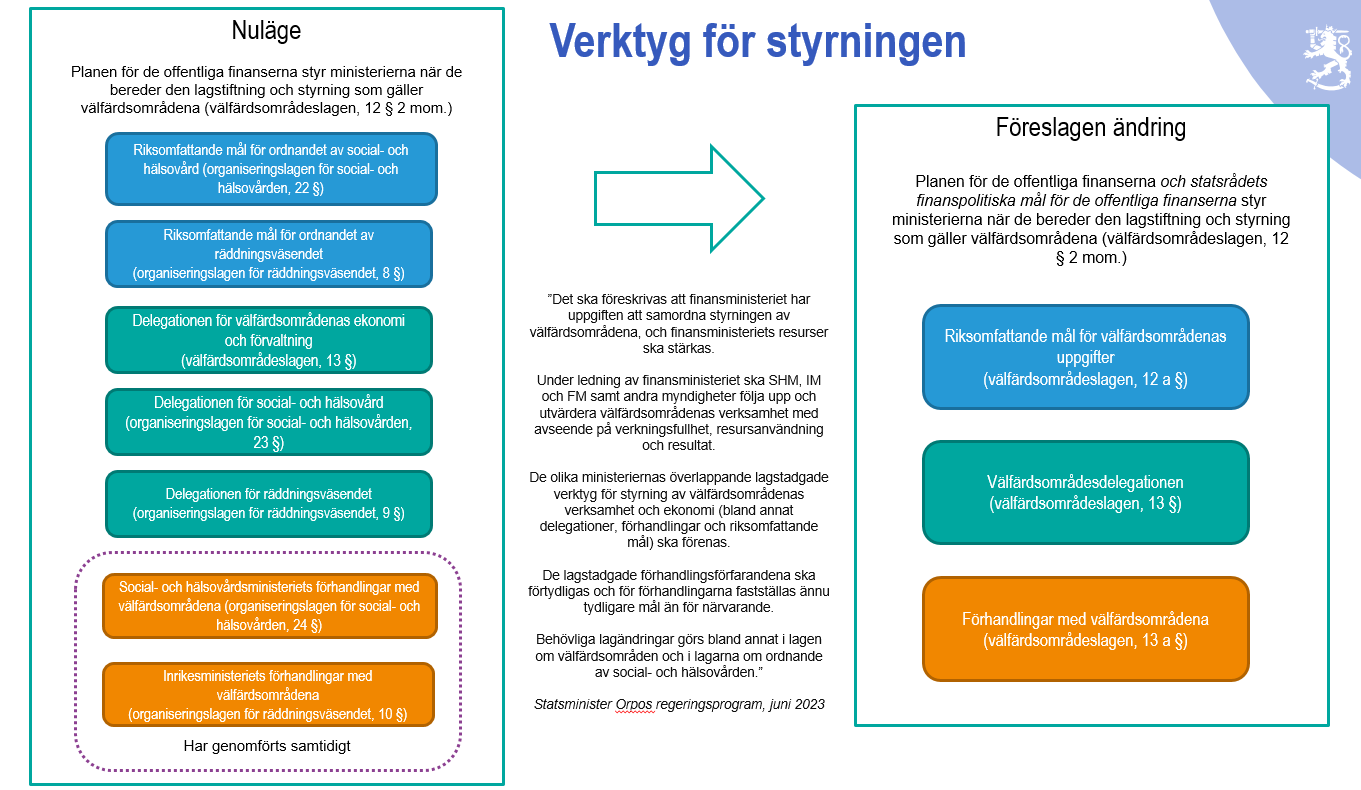 Avsikten är inte att ändra den gällande lagstiftningens syfte att främja samarbetet mellan ministerierna och välfärdsområdena och förhandlingar som utgör en del av ministeriernas och välfärdsområdenas kontinuerliga dialog, utifrån vilken verksamheten kan utvecklas på grundval av samförstånd och erfarenheter från de olika områdena.