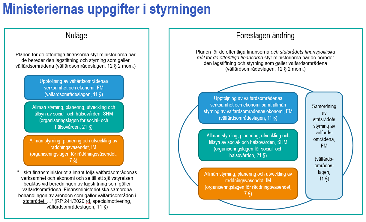 I 1 mom. kompletteras finansministeriets uppgifter. Liksom nu följer finansministeriet allmänt välfärdsområdenas verksamhet och ekonomi och ser till att välfärdsområdenas självstyrelse beaktas vid beredningen av lagstiftning som gäller välfärdsområdena. Dessutom svarar finansministeriet för den allmänna styrningen av välfärdsområdenas ekonomi och verksamhet, och samordnar statsrådets styrning av välfärdsområdena. Finansministeriet har redan hittills skött de nämnda uppgifterna utan att det uttryckligen har föreskrivits om det i lagen. Uppgifterna anges i paragrafen och inte endast i motiveringen till den. Dessutom korrigeras en felaktig böjning i den sista satsen i den finskspråkiga lagen.