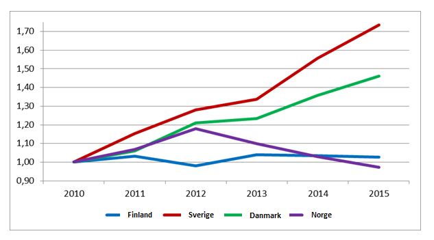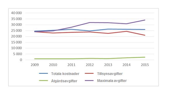Utvecklingen av Finansinspektionens kostnader och åtgärdsavgifter under åren 2009—2015 beskrivs nedan i tabell 1 och i figurerna 1 och 2. Tillsynsavgiftslagen från 2008 utarbetades så att det maximala beloppet i lagen togs ut till fullt belopp så att Finansinspektionens kostnader skulle kunna täckas under dess första hela verksamhetsår. Därefter har ökningen av balansräkningar för de tillsynsobjekt som hör till finanssektorn lett till att det maximala avgiftsbelopp som möjliggörs i lagen har ökat med tio miljoner till cirka 34 miljoner euro. Däremot har utvecklingen i fråga om Finansinspektionens totala kostnader och de tillsynsavgifter som i praktiken tagits ut varit mycket måttfull. Även en nordisk jämförelse visar att kostnadsutvecklingen för Finansinspektionen har varit måttfull i synnerhet i förhållande till Sverige och Danmark.