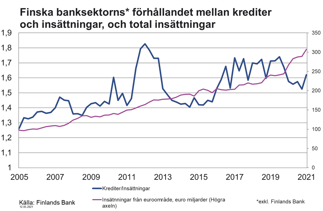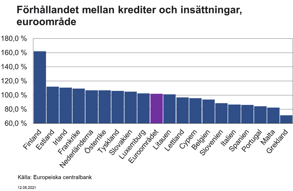Förhållandet mellan ut- och inlåning inom den finländska banksektorn avviker avsevärt från andra länder inom euroområdet. I Finland är relationstalet cirka 160 procent, vilket innebär att bankernas utlåning är 1,6 gånger större än inlåningen. I utlåningen är de finländska bankerna mer beroende av marknadsfinansiering än i genomsnitt. I euroområdet är relationstalet cirka 102 procent i genomsnitt, vilket innebär att utlåningen på det stora hela kan finansieras med inlåning. En banksektor med ett högt relationstal är mer exponerad för finansieringsrisker och störningar på finansmarknaden.