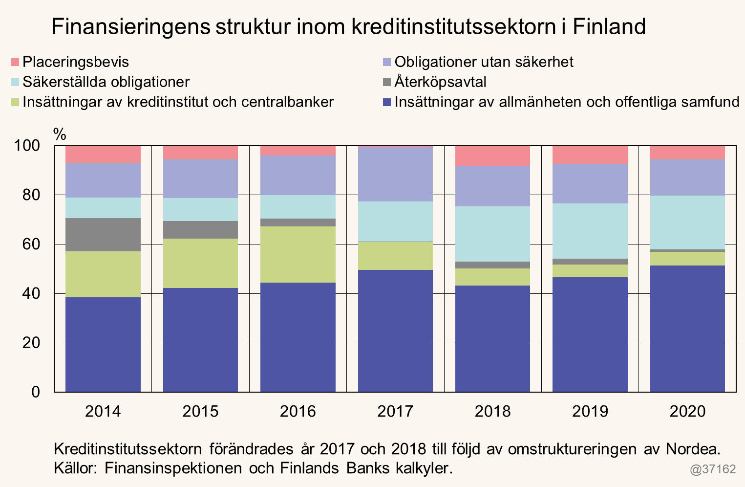 Enligt Finansinspektionen är de finländska bankernas marknadsbaserade finansiering relativt väl diversifierad mellan olika finansieringskällor. Säkerställda obligationer står dock för en stor andel av finansieringen. För hela kreditinstitutssektorn i Finland var de säkerställda obligationernas andel av finansieringen under första kvartalet 2020 cirka 20 procent. Andelen obligationer utan säkerhet var 15 procent och andelen placeringsbevis 7 procent av de finländska bankernas totala finansiering. Finansinspektionen: (15.9.2020) (bara på finska). Jämfört med bruttonationalprodukten är de säkerställda obligationernas andel något större än i de flesta europeiska länder men inte lika stor som i Danmark, Sverige och Norge. Största delen av de säkerställda obligationerna i de inhemska bankernas likviditetsreserv har emitterats av andra nordiska banker. Samma banker är ofta både emittenter av och investerare i säkerställda obligationer.