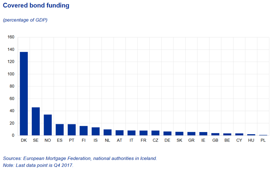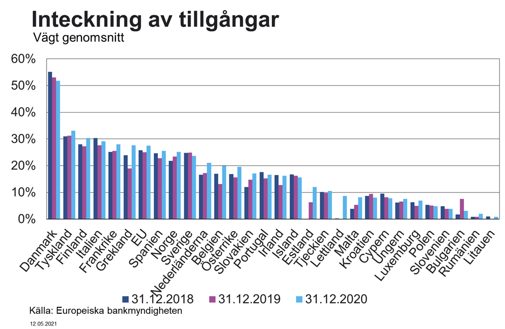 Andelen intecknade tillgångar i de europeiska bankernas balansräkningar är störst i de länder där bland annat säkerställda obligationer är ett viktigt instrument för finansiering. I länder där återköpsavtal eller centralbanksfinansiering används i hög grad är andelen intecknade tillgångar i balansräkningen dessutom större. På europeisk nivå bildades de intecknade tillgångarna (encumbered assets) i bankernas balansräkningar i slutet av år 2020 till cirka 23 procent av säkerställda obligationer och en lika stor andel återköpsavtal. Centralbanksfinansieringens andel ökade från 12 procent året innan till 21 procent, vilket minskade de övriga posternas andelar.