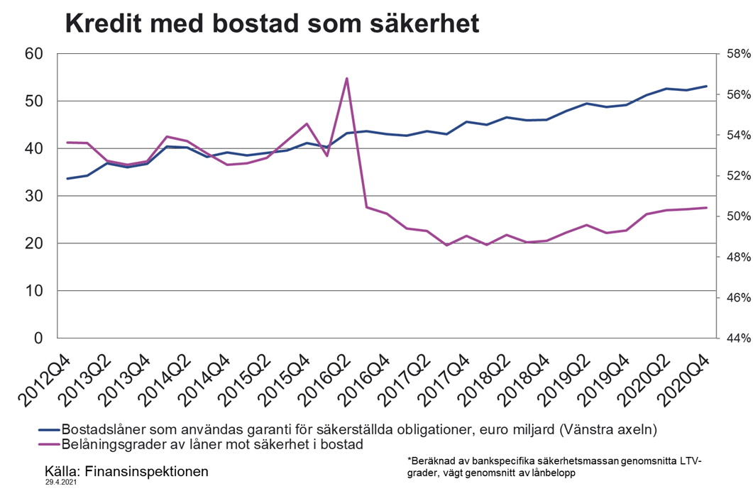 Emission av säkerställda obligationer ökar inteckningen av bankernas tillgångar (asset encumbrance). Inteckningen av den finländska banksektorns tillgångar var i slutet av juni 2019 sammanlagt 30 procent, vilket var något högre än för EU-området i genomsnitt (3/2019: 28 procent). Mest tillgångar intecknas fortfarande som säkerhet för säkerställda obligationer (cirka 67 procent av de intecknade tillgångarna), trots att andelen derivat och återköpsavtal har ökat avsevärt efter flyttningen av Nordeas hemvist. En stor inteckningsgrad för balansräkningen kan öka bankens kostnader för finansiering, vilket i synnerhet påverkar räntorna på obligationer utan säkerhet. I en allvarlig stressituation på bostadsmarknaden kan också efterfrågan på säkerställda obligationer minska och finansieringskostnaderna öka. (bara på finska).