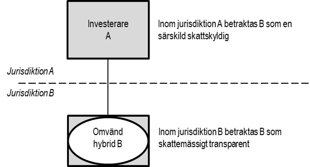 Vid beskattningen inom jurisdiktion A anses subjektet B vara en särskild skattskyldig, medan ur jurisdiktion B:s synvinkel är subjekt B transparent vid beskattningen. B är därmed ett hybridsubjekt som avses i direktivet, alltså det som enligt OECD:s definition är en omvänd hybrid (reverse hybrid).