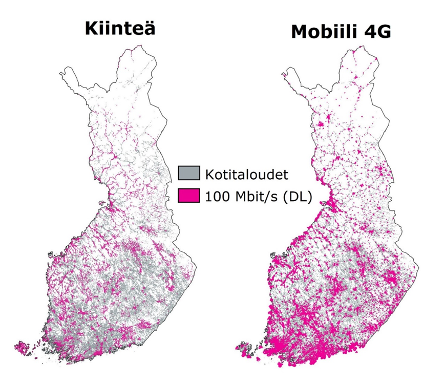 Det finns regionala skillnader också i täckningen för mobiltelenätet. I huvudstadsregionen har alla hushåll en teoretisk maximihastighet på 100 Mbit/s i mobilnätet, medan endast mindre än hälften av hushållen i vissa mindre kommuner hade tillgång till ett så snabbt nät i slutet av juni 2019. I dessa kommuner finns det färre invånare och därmed färre potentiella abonnenter än i huvudstadsregionen, vilket innebär att invånarna de facto kan ha snabbare mobilförbindelser än i huvudstadsregionen, där många måste dela på bandbredden. När det gäller fasta förbindelser är det, oberoende av boningsort och antalet användare, lättare att nå visshet om vilken hastighet som kan nås.