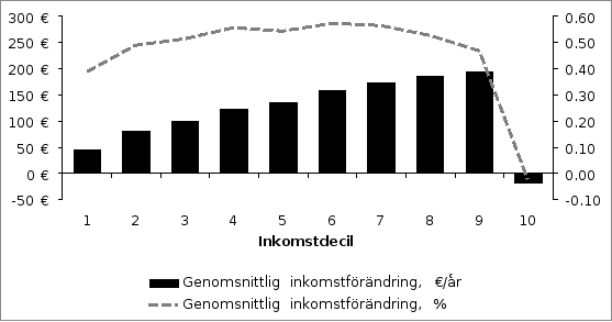 Som helhet sedd skärps beskattningen av arbete i inkomstintervallet ca 0—14 300 euro och för dem som förtjänar mer än 24 000 euro per år, med beaktande av stigande inkomstnivå och löntagarnas förändrade avgifter av skattenatur. För medelinkomsttagare skärps beskattningen ca 0,4 procentenheter och högst ca 0,56 procentenheter.