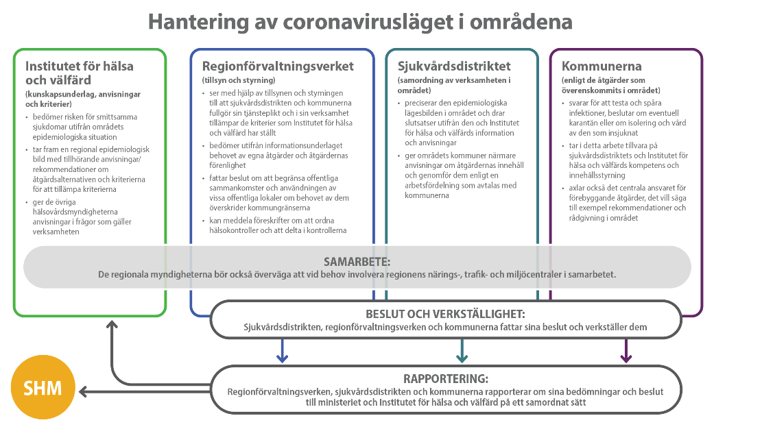 Inom ramen för sitt ledningsmandat för störningssituationer i hälso- och sjukvården har social- och hälsovårdsministeriet den 10 september 2020 uppmanat sjukvårdsdistrikt, kommuner och samkommuner, Institutet för hälsa och välfärd, regionförvaltningsverken samt Ålands landskapsregering att bereda sig på att fortsätta med åtgärder enligt lagen om smittsamma sjukdomar på sina områden för att förhindra spridningen av den infektion som orsakas av coronaviruset. Sjukvårdsdistrikten skulle utan dröjsmål inleda åtgärder för att organisera samarbetet mellan myndigheterna på sitt område samt bereda sig på de åtgärder situationen kräver. Regionförvaltningsverken ska i egenskap av tillsynsmyndigheter inom sina områden sörja för förberedelser för och organiseringen av prövning och beslutsfattande. Dessutom har de uppmanats att delta i åtgärderna i enlighet med sitt lagstadgade ansvar. Institutet för hälsa och välfärd deltar i den regionala organiseringen inom sina ansvarsområden, liksom också kommuner och samkommuner.