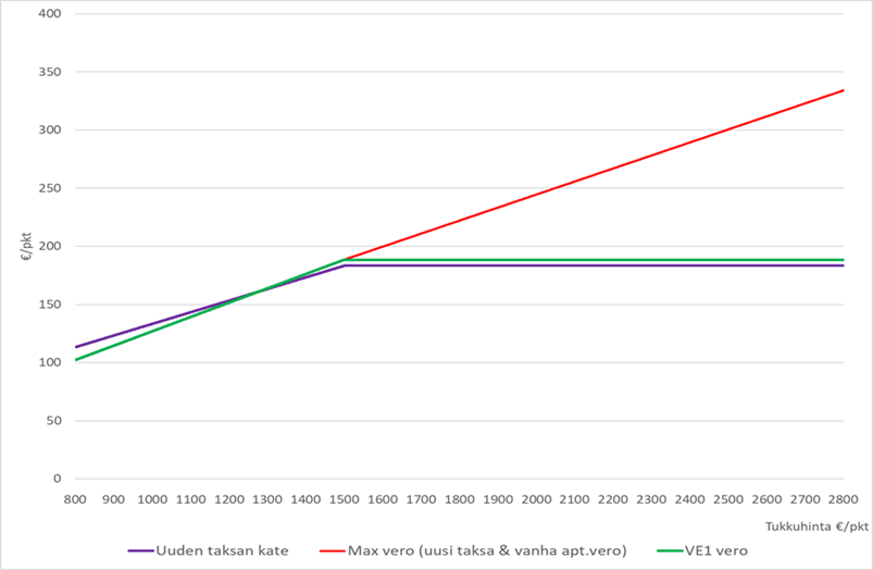 (Bildtexter på svenska: €/pkt = €/förpackning, Tukkuhinta €/pkt = Partipris €/förpackning, Uuden taksan kate = Försäljningsbidrag, ny taxa, Max vero (uusi taksa & vanha apt.vero) = Maxskatt (ny taxa & gammal apoteksskatt), VE1 vero = VE1 skatt)