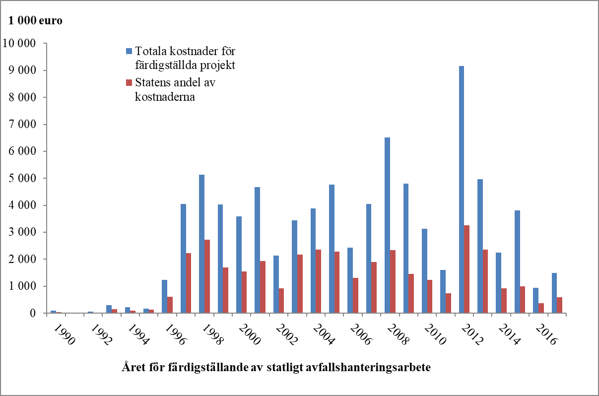 Figur 2. De totala kostnaderna för projekt som färdigställts som statliga avfallshanteringsarbeten samt statens andel av kostnaderna åren 1990—2017. Källa: SYKE 2018.