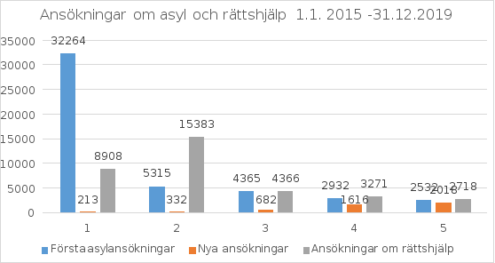 Åren 2015–2019 gjordes det 52 269 asylansökningar och fattades under samma tid 34 646 rättshjälpsbeslut, vilket utgör 66 procent av antalet ansökningar. Nästan alla rättshjälpsbeslut i ärendegruppen för internationellt skydd är positiva. Under hela referensperioden fattades sammanlagt 307 negativa beslut, vilket är ca 0,89 procent av det totala antalet beslut.