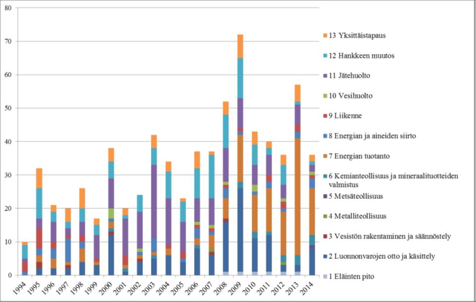Bedömningsförfarandet tillämpas enligt 4 § på projekt som kan ha betydande skadliga miljökonsekvenser. Genom förordning av statsrådet föreskrivs om vissa typer av projekt som alltid ska genomgå miljökonsekvensebedömning. Projektförteckningen i förordningens 6 § innehåller 50 typer av projekt grupperade i 11 sektorer. Förfarandet tillämpas inom följande sektorer: 1) djurhållning, 2) tagande och bearbetning av naturtillgångar, 3) byggande i vattendrag och vattenreglering, 4) metallindustri, 5) skogsindustri, 6) kemisk industri och produktion av mineralprodukter, 7) energiproduktion, 8) överföring och lagring av energi och substanser, 9) trafik, 10) vatten och avlopp, 11) avfallshantering samt 12) ändringar av projekt, om ändringarna till storleken motsvarar de projekt som avses i 1-11 punkten. Projektförteckningen i förordningen är uttömmande.