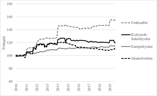 Figur 2. Prisutvecklingen för mineralvatten och vissa andra läskedrycker från och med 2010, år 2010=100