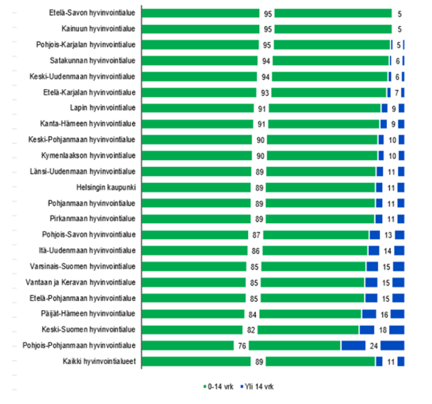 Av de uppgifter om besök hos primärvården som lämnats till Avohilmo-registret bildas databasrapporter om tillgången till vård. Av figur 1 framgår tillgången till öppen sjukvård inom primärvården i välfärdsområdena inom den längsta väntetiden på 14 dygn år 2024. Figuren omfattar alla åldersgrupper. I genomsnitt genomfördes 89 procent av besöken i välfärdsområdena inom den längsta väntetiden på 14 dygn.