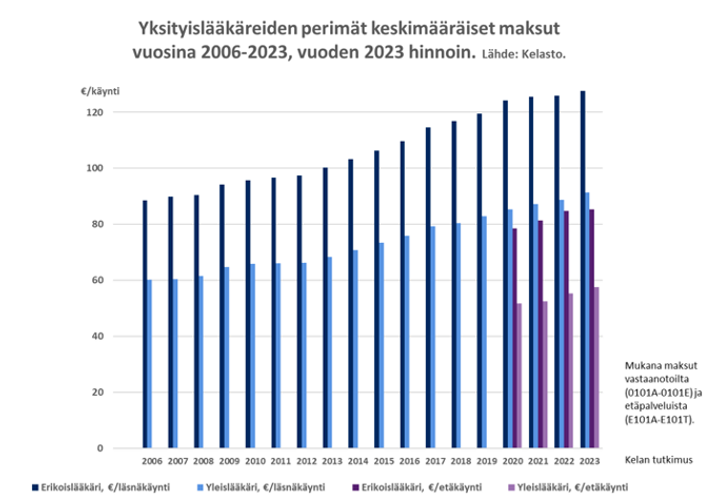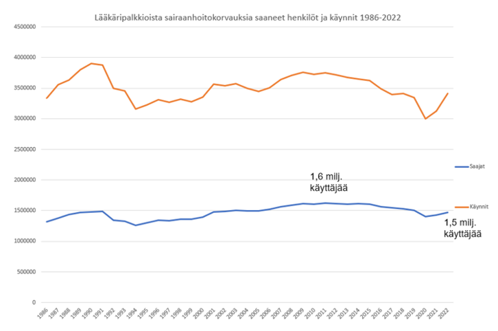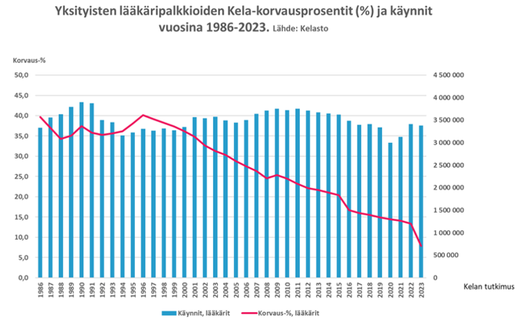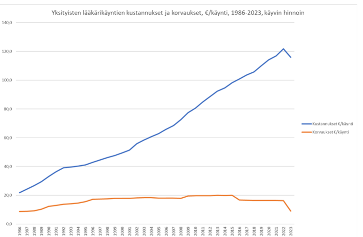 På lång sikt har anlitandet av privata läkartjänster minskat i förhållande till befolkningsutvecklingen. Åren 2014–2023 sjönk den andel av kostnaderna för privata läkartjänster som Folkpensionsanstalten ersatte. Detta beror delvis på att konsumenternas köpkraft försämrats till följd av inflationen, vilket påverkar anlitandet av privata tjänster.
