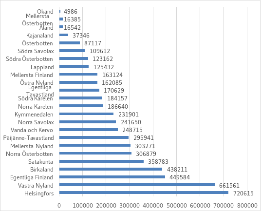 Antalet anställda inom den offentliga sektorns social- och hälsovårdstjänster i förhållande till invånarantalet varierar från region till region. Antalet anställda inom hälso- och sjukvården i förhållande till invånarantalet var störst i Mellersta Österbottens välfärdsområde, där det 2023 fanns 337 anställda per 10 000 invånare. Minst anställda i förhållande till invånarantalet fanns det i Vanda och Kervo välfärdsområde, där det 2023 fanns 112 anställda per 10 000 invånare.