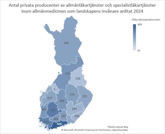 I figur 14 anges landskapsvis antalet tjänsteproducenter som landskapets invånare anlitar för de allmänläkartjänster och specialistläkartjänster inom allmänmedicin som tillhandahålls inom den privata hälso- och sjukvården. Välfärdsområdet eller landskapet bestäms enligt patientens bostadsort. Samma läkare eller tjänsteproducent kan således synas i uppgifterna från flera landskap på grund av att patienter reser över regiongränserna. Med tjänsteproducent avses verksamhetsställe. I hela landet betalades 2024 ersättning till 564 tjänsteproducenter för besök hos allmänläkare eller specialister i allmänmedicin.