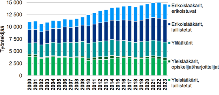 Läkarnas andel av de anställda inom hälso- och sjukvården uppgick 2023 till 11,5 procent (cirka 14 500 anställda). Inom hälso- och sjukvården arbetade merparten av läkarna, (73,0 %) inom sjukhustjänster (cirka 10 600 anställda). Vid hälsovårdscentralerna arbetade 25,8 procent av läkarna (cirka 3 800 anställda). Av figur 2 framgår utvecklingen av antalet läkare, indelade i undergrupper, inom den offentliga hälso- och sjukvården under 2000-talet.