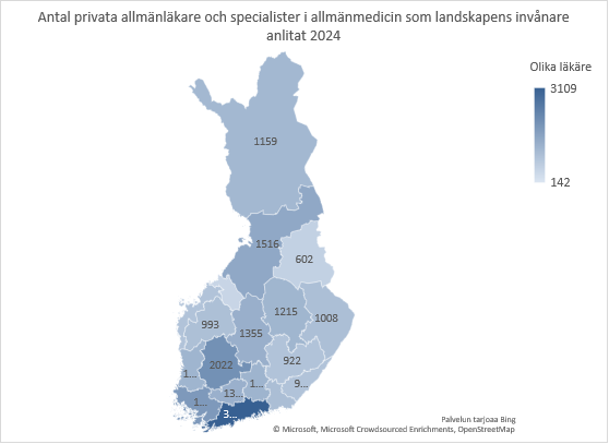 Antalet allmänläkare och specialister i allmänmedicin enligt landskap 2024, utifrån antalet besök som ersatts av Folkpensionsanstalten. Källa: Folkpensionsanstaltens forskning.