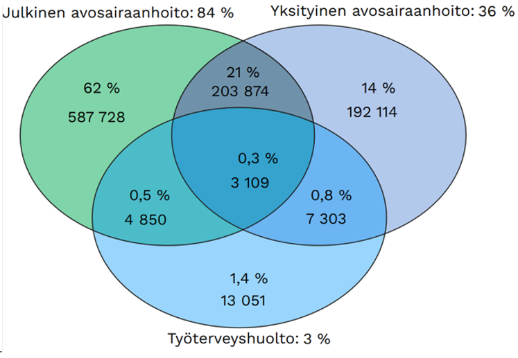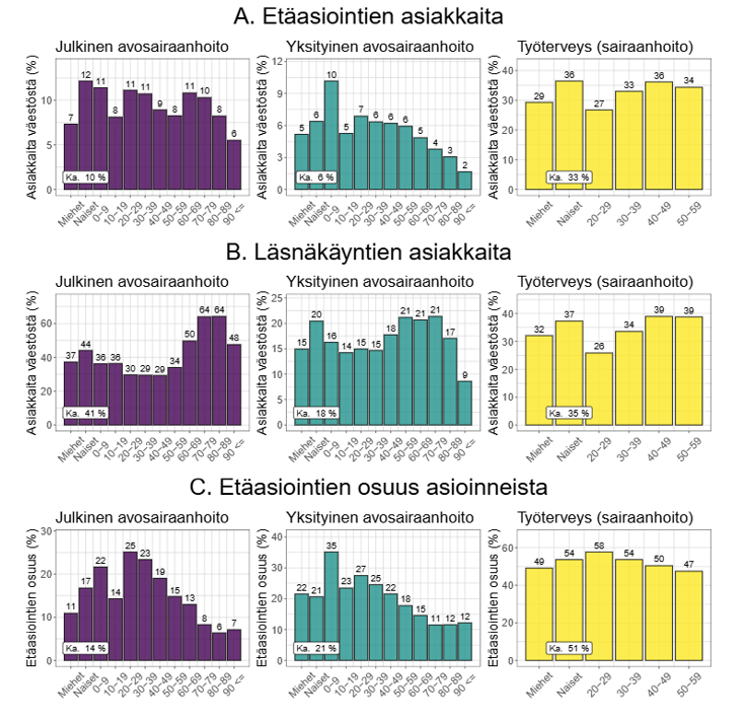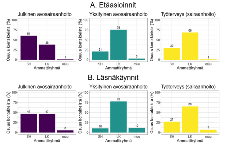 utreddes användningen, användarna, produktionen och effekterna av digitala tjänster med hjälp av finländskt registermaterial. Enligt undersökningen avviker den privata öppna sjukvården och företagshälsovården avsevärt från den offentliga öppna sjukvården, eftersom deras verksamhet är mycket mer läkarcentrerad. I figuren nedan anges andelen kontakter med sjukskötare, läkare eller andra yrkesutbildade personer inom hälso- och sjukvården, indelade i offentlig öppen sjukvård, privat öppen sjukvård och sjukvård inom företagshälsovården samt distansmottagningar och fysiska mottagningar.