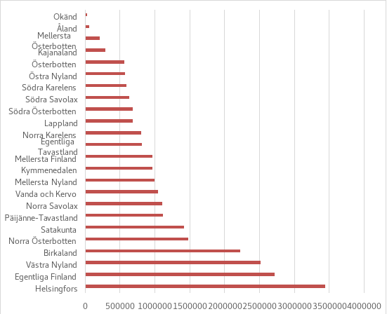 Enligt figur 12 betalas mest ersättningar i euro för besök inom den privata sjukvården hos allmänläkare och specialister i allmänmedicin till personer som har fyllt 65 år i Helsingfors, Västra Nyland, Egentliga Finland och Birkaland och minst ersättningar i Mellersta Österbotten, på Åland och i Kajanaland. Sett till antalet besök är situationen i hög grad också densamma i välfärdsområdena. Antalet besök enligt välfärdsområde av försäkrade som har fyllt 65 år anges i figur 13.
