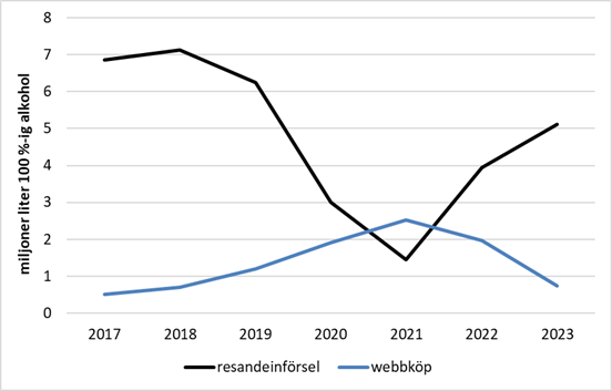 . Genom en enkät har information om webbköp av alkoholdrycker samlats in sedan 2017. Mängden alkohol som beställs från utländska webbutiker har enligt enkäten vuxit under den tid webbköpen följts. Före coronapandemin köptes ca 1,2 miljoner liter hundraprocentig alkohol på webben 2019. Detta utgjorde cirka tre procent av den sammanlagda alkoholkonsumtionen. Pandemin som började 2020 och de resebegränsningar som den föranledde minskade i betydande grad resenärsinförseln av alkohol medan webbköpen samtidigt ökade så att webbköpen av alkoholdrycker 2021 överskred resandeinförseln, vilket framgår av diagrammet nedan. I och med att begränsningarna lyftes och resandet återhämtade sig ökade resandeinförseln av alkoholdrycker avsevärt efter början av år 2022 medan webbköpen av alkoholdrycker från utlandet minskade. År 2023 fortsatte webbköpen av alkohol att minska.