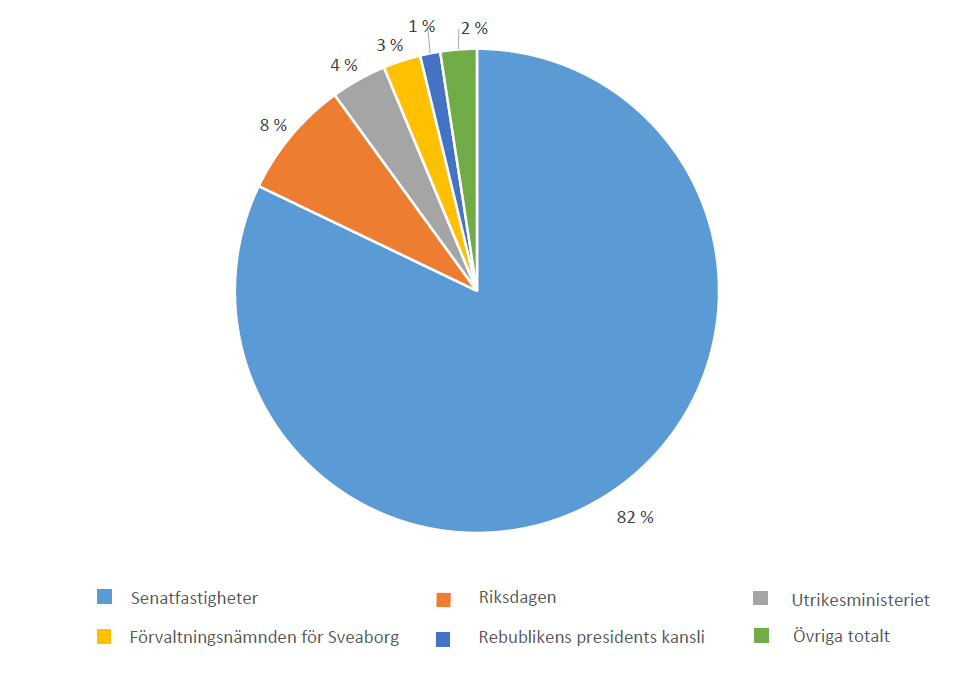 Enligt bokslutsuppgifterna för 2019 hade Senatfastigheter i sin besittning 82 procent (3 179 miljoner euro), riksdagen 8 procent (305 miljoner euro), utrikesministeriet 4 procent (144 miljoner euro), förvaltningsnämnden för Sveaborg 3 procent (97 miljoner euro), republikens presidents kansli 1 procent (52 miljoner euro) och övriga sammanlagt 2 procent (94 miljoner euro) av statens bebyggda fastighetsegendom.