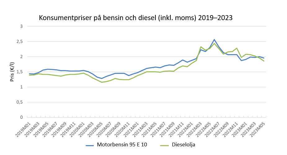 Figur 1: Konsumentpriser på bensin och diesel från januari 2019 till maj 2023. Källa: Statistikcentralen (2023).