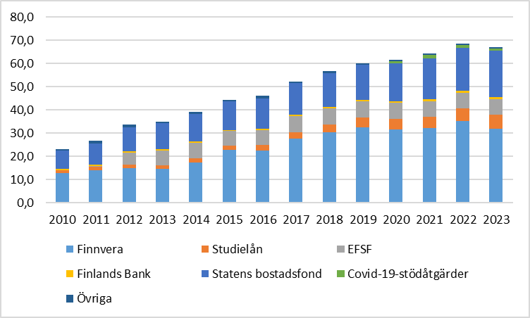 Statens borgens- och garantiansvar har ökat betydligt (figur 2). Ansvarsbeloppet var ännu 2010 cirka 23 miljarder euro. Motsvarande siffra var 67 miljarder euro i slutet av 2023.
