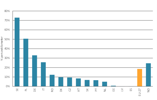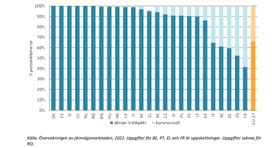 Kommissionens övervakningsrapport visar att av de 149 miljoner passagerarkilometer som omfattades av allmän trafikplikt 2020 tillryggalades 28 procent inom tjänster som hade upphandlats genom konkurrensutsatt upphandling. Relativt sett skedde 92 procent av all konkurrensutsatt upphandling inom EU i Tyskland och Sverige, som avreglerade tjänster tidigt. Av denna upphandling skedde 80 procent i Tyskland och 12 procent i Sverige. Marknadsandelen för nya aktörer på marknaden för passagerartrafik som omfattas av allmän trafikplikt är störst i Sverige, Polen och Tyskland. Mellan 2015 och 2020 har marknadsandelen för nya aktörer ökat mest i Sverige och Tyskland. År 2020 hade nya aktörer när det gäller den kommersiella persontrafiken på järnväg en genomsnittlig marknadsandel på 6,6 procent och när det gäller de nationella marknader för passagerartrafik som omfattas av allmän trafikplikt en marknadsandel på 18,5 procent. COM(2023) 510 final De nya aktörernas marknadsandel har alltså varit större inom den trafik som omfattas av allmänna trafikplikt än inom den trafik som bedrivs på marknadsvillkor.