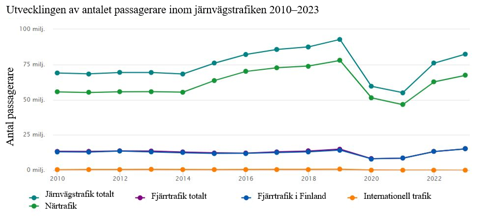 Antalet passagerare inom persontågstrafiken i Finland har ökat under det senaste decenniet. Biljettpriserna har sjunkit från och med 2015. Antalet passagerare på järnvägarna ökade stadigt efter mitten av 2010-talet fram till coronapandemin. Till följd av pandemin minskade antalet passagerare inom närtrafiken till och med 2021 med cirka 40 procent jämfört med 2019. Inom fjärrtrafiken minskade antalet passagerare med 43 procent. Under 2022 vände antalet passagerare uppåt, och det totala antalet passagerare inom järnvägstrafiken ökade med 38 procent jämfört med året innan. Det totala antalet passagerare ökade med åtta procent 2023 jämfört med 2022. Från 2022 till 2023 ökade antalet passagerare inom närtrafiken med sju procent och inom fjärrtrafiken med 14 procent. Antalet passagerare inom den internationella järnvägstrafiken har minskat ytterligare på grund av Rysslands anfallskrig, men som helhet betraktat var antalet passagerare inom järnvägstrafiken endast cirka 11 procent lägre 2023 än 2019. Sett till antalet passagerare är närtågstrafiken klart större än fjärrtågstrafiken, men när det gäller passagerarkilometer är fjärrtågstrafiken av betydligt större betydelse. Antalet passagerare inom närtågstrafiken har ökat till följd av att spårtrafiken i städerna har utvidgats, och