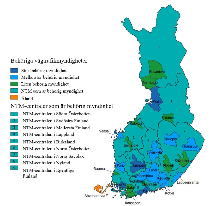 De behöriga myndigheter som avses i trafikavtalsförordningen anges nationellt i 181 och 182 § i lagen om transportservice. I 181 § anges behöriga vägtrafikmyndigheter och i 182 § behöriga järnvägstrafikmyndigheter. Enligt 182 § är kommunikationsministeriet och, inom sitt behörighetsområde, Samkommunen Helsingforsregionens trafik, nedan Helsingforsregionens trafik , de behöriga järnvägstrafikmyndigheter som avses i trafikavtalsförordningen. Helsingforsregionens trafik är en samkommun vars medlemskommuner är Helsingfors, Esbo, Vanda, Grankulla, Kervo, Sibbo, Tusby, Kyrkslätt och Sjundeå. Helsingforsregionens trafik svarar för utarbetandet av en trafiksystemplan för Helsingforsregionen, planerar och organiserar kollektivtrafiken inom sitt verksamhetsområde och främjar kollektivtrafikens verksamhetsförutsättningar. Helsingforsregionens trafik köper också tjänster inom buss-, spårvagns-, metro-, färje- och närtågstrafiken, godkänner kollektivtrafikens taxe- och biljettsystem samt biljettpriser, svarar för marknadsföringen av kollektivtrafiken och för informationen till passagerarna om den och ordnar biljettförsäljningen. Helsingforsregionens trafik svarar också för biljettkontrollen. Den tågtrafik som ordnas av Helsingforsregionens trafik bildar tillsammans med den övriga kollektivtrafiken i regionen en helhet som i stor utsträckning tillgodoser människors behov av att röra sig i huvudstadsregionen. Jämfört med de behöriga myndigheterna inom vägtrafiken har behörighetsområdena inom järnvägstrafiken varit oförändrade, och kommunikationsministeriet har inte under de senaste åren fått förslag om nya behöriga myndigheter eller andra ändringar i behörighetsområdena inom järnvägstrafiken. Ändringar i vägtrafikmyndigheternas behörighetsområden är relativt vanliga, och det finns etablerade processer för dem.